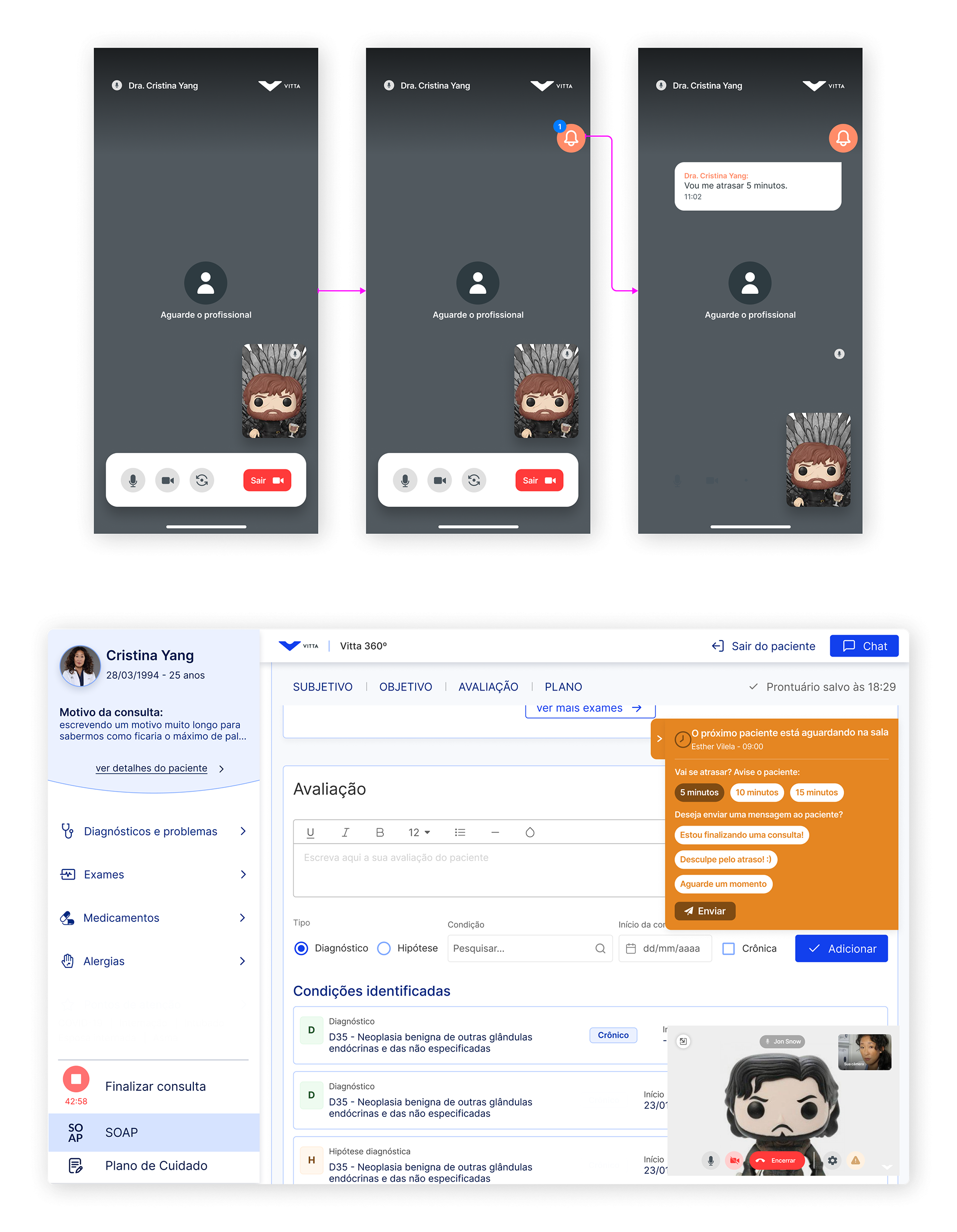Implementamos um novo fluxo de comunicação que permitiu aos médicos notificar pacientes de forma rápida sobre atrasos, garantindo transparência e reduzindo incertezas no atendimento.